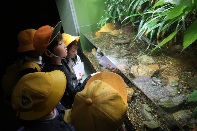 午後からは、館内をグループごとに見学しました。さまざまな色や形をした淡水魚をじっくり観察し、「こんな魚がいるんだ!」と驚きの声があがっていました。最後はえさやり体験でしめくくり、生き物とのふれあいを通して自然への関心をさらに深めることができました。
