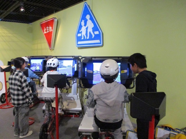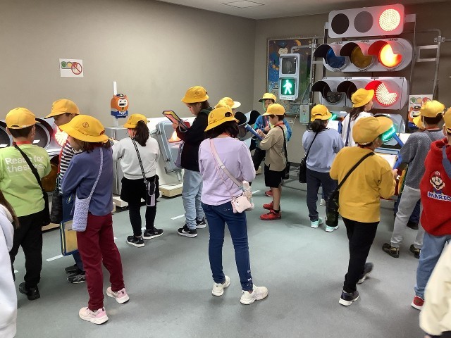 愛知県警察本部へ見学に行きました。本物の白バイに乗ったり、自転車のシュミレーション体験をしたりしました。交通管制センターでは、様々な信号機を見させていただきました。児童は、目の前で見る大きな信号機や明るいライトに驚いていました。通信指令室の大きなモニターも見ることができました。警察官がどのような仕事をしているのかを学ぶいい機会になりました。
