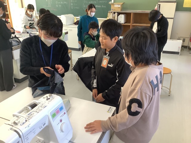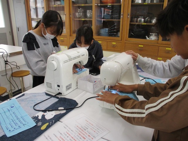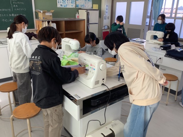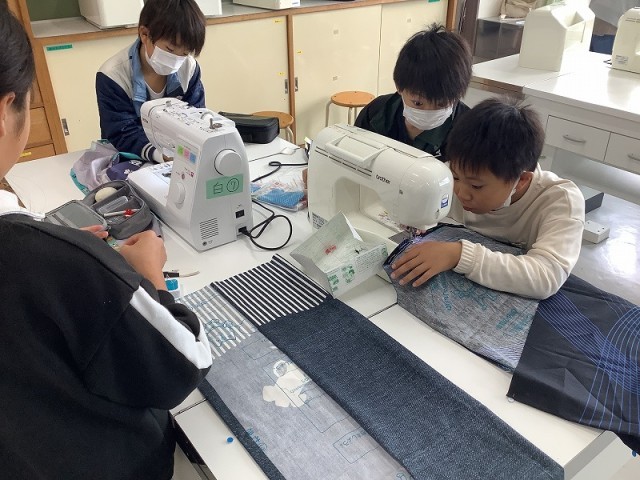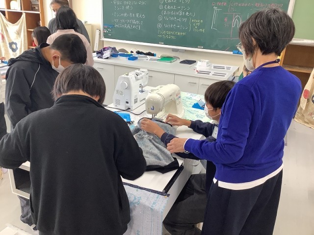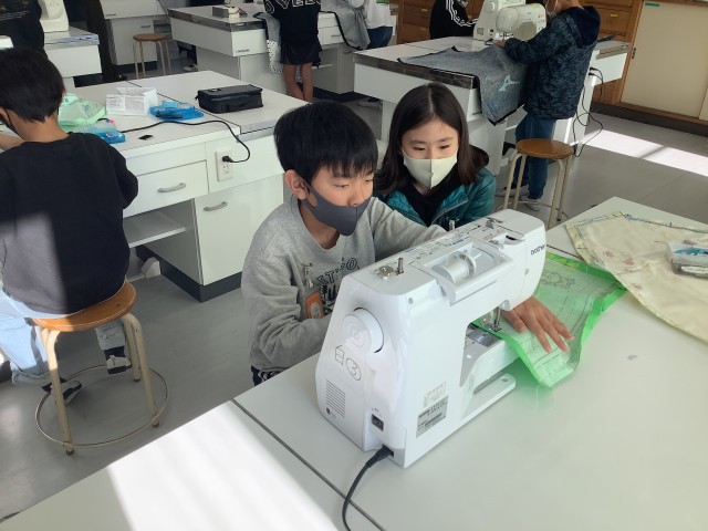 学校支援ボランティアの方々にご協力いただきながら、ミシンを使ってエプロン作りに取り組んでいます。しつけの仕方やミシンの使い方を教えていただきながら、楽しく学習することができました。