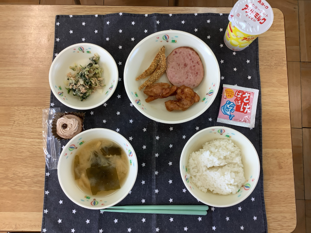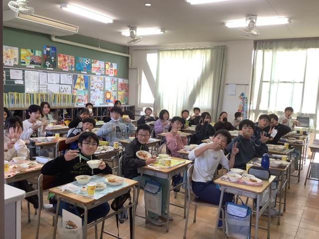 11月14日(金)に、6年生は特別給食をいただきました。献立は、ごはん(さけふりかけ付き)、白みそ汁、きびなごのカリカリフライ、ハムステーキ、鶏肉のレモン煮、ツナ和え、アシドミルク、セレクトデザートです。「どのメニューもおいしすぎる」「毎日食べたい」などと口にしながら、笑顔いっぱいで給食をほおばっていました。
