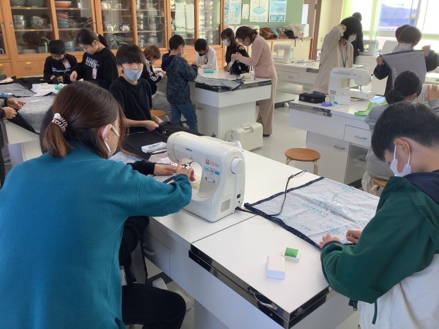 先週に引き続き、学校支援ボランティアのみなさんにご協力いただいて、エプロン製作に取り組みました。うまく縫えないところを手伝ってもらったり、やりやすくなるようにアドバイスをもらったりしながら、完成に向けて製作しました。
