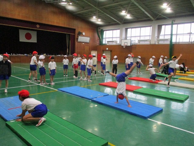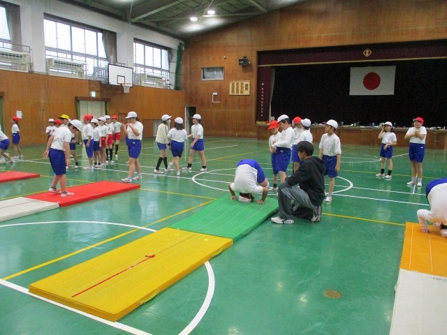 マット運動を行いました。前転、後転の他にも側方倒立回転も学習しました。手の付き方や足の伸ばし方などに気を付けて、自分たちで考えながら何度も練習をしました。