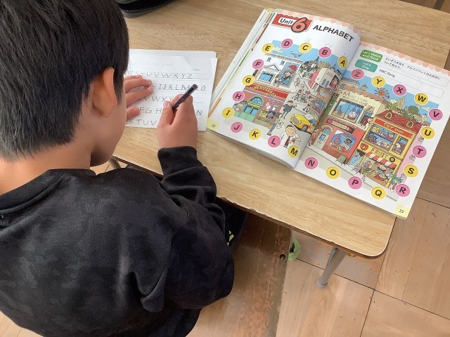 外国語の授業の様子です。歌を歌ったり、アルファベットを書いたりしました。ペア活動では、「name please」と言い、お互いに自分の名前を書く練習をしました。どの児童も主体的に授業に参加していました。