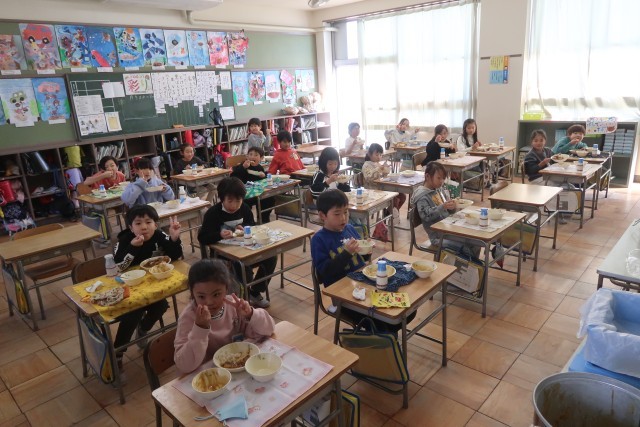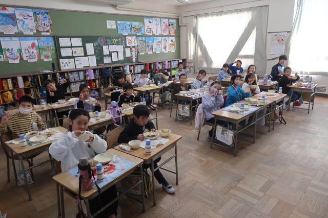 今日の給食は、みんなが楽しみにしていたカレーライスでした。2年生は、体育の時間にたくさんなわ跳びの練習をしたので、みんなおなかがペコペコでした。頑張った分、大好きな給食のおいしさは倍増ですね。給食の時間は、幸せそうな顔であふれていました。