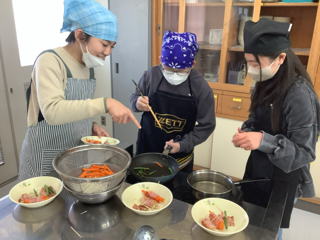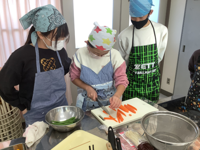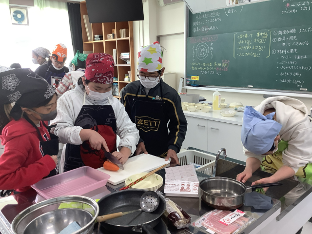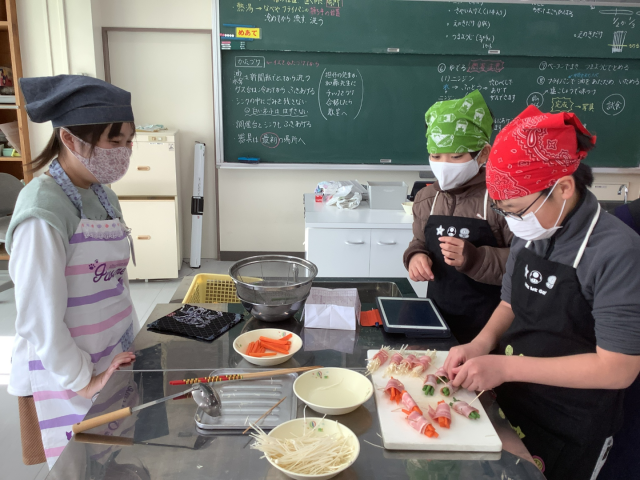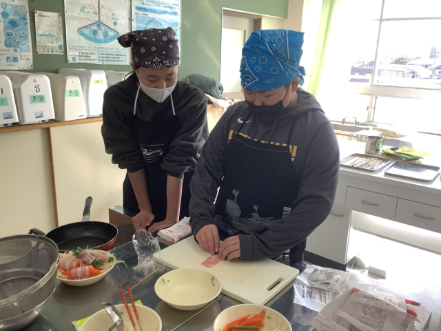 今回の調理実習では、野菜のベーコン巻きを作りました。班のメンバーで声を掛け合い、役割分担をしながら協力して調理をしました。全員怪我なく最後まで安全に気を付けておいしく調理をすることができました。小学校の家庭科で行う実習は今回が最後でした。小学校で学んだことをこれからの生活に活かしてほしいと思います。