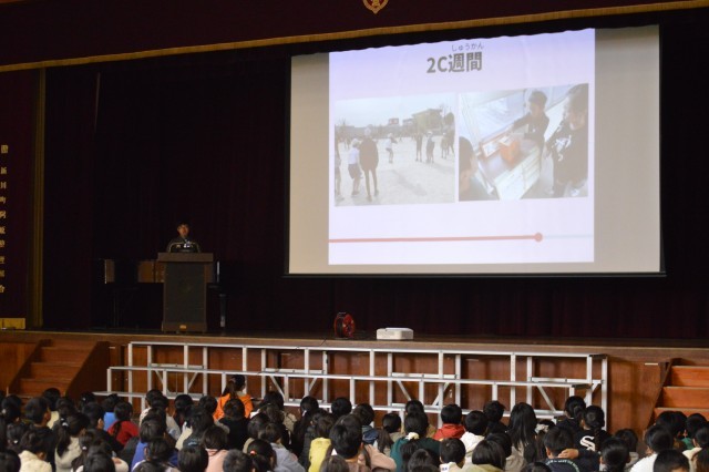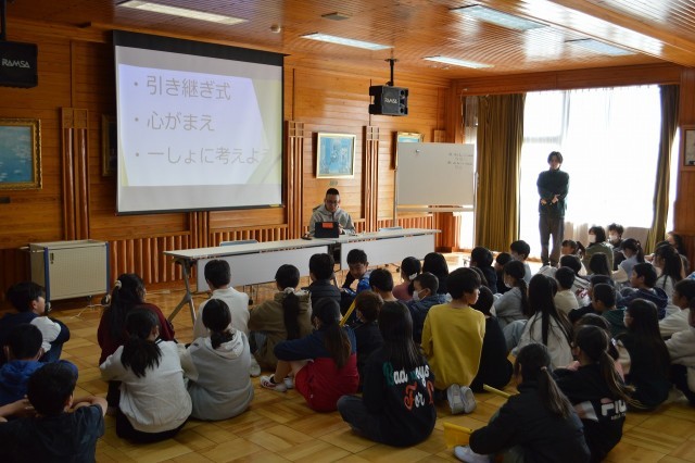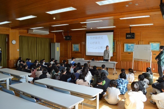 次に校長先生のお話を聞きました。スクリーンの写真を見ながら、2学期の行事や学習の様子を振り返りました。どの行事や学習に対しても、協力して一生懸命取り組むことができていたと言っていただきました。温かい言葉で話す人や元気に挨拶をする人が増え、学校の雰囲気がよくなったことも教えてもらいました。子どもたちは2学期の生活を振り返りながら、満足気な様子でお話を聞いていました。