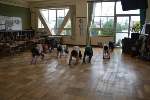 本日、休み時間に震度5強の地震が発生したという想定で、本年度3回目の避難訓練を行いました。児童は、教室、運動場、図書室、廊下、トイレなど、それぞれがいた場所で身を守る行動をとり、落ち着いて安全確保に努めました。また、校舎内の床に亀裂が入ったという設定のもと、後続地震が続く状況を想定しながら、体育館へ避難しました。