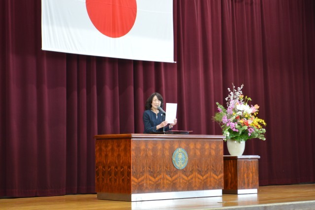 はじめに表彰伝達を行いました。赤い羽根コンクール(書道の部・ポスターの部)と敬老キャンペーンの表彰を行いました。子どもたちが一生懸命制作した作品が高い評価を受けられてよかったです。表彰を受けた子どもたちは、壇上で堂々と表彰状を受け取ることができました。