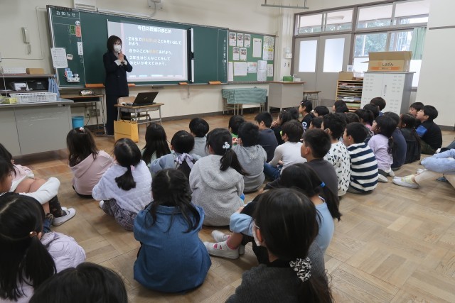 2年生は、スクールカウンセラーの田丸先生のお話を聞きました。1年間を振り返って、どんなことができるようになったか、どんなことを頑張ったかみんなで紹介し合いました。また、頑張った自分をほめてあげることが大切だということも教えてもらいました。ぜひ、お家でも頑張ったことを一緒に認めて、3年生に向けて頑張る気持ちを高めてあげてください。