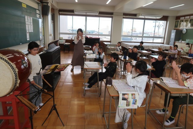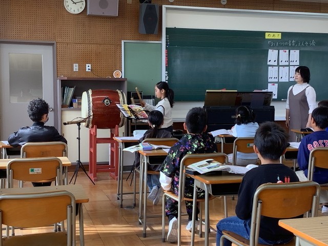 2年生は、音楽の授業で和太鼓を使ったリズム打ちの発表会がありました。自分で考えた、自分だけのリズムでみんな楽しそうに演奏をしていました。