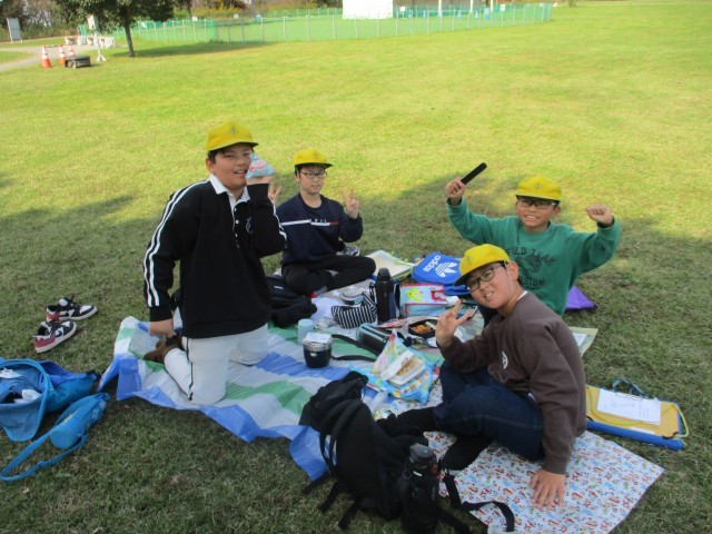 学習のあとは、木曽三川公園カルチャービレッジの広い芝生に敷物を広げ、お弁当を味わいながら、友達との会話を楽しみました。