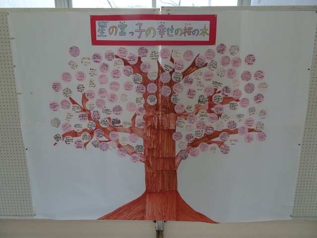 3月2日(月)~3月6日(金)の5日間、児童会の活動として、「星の宮っ子の幸せの桜の木」の取り組みを行いました。この一年の思い出と、感謝の気持ちをカードに書きました。みんなの思い出や感謝の気持ちが集まり、素敵な桜が昇降口に咲き、温かい雰囲気が広がりました。