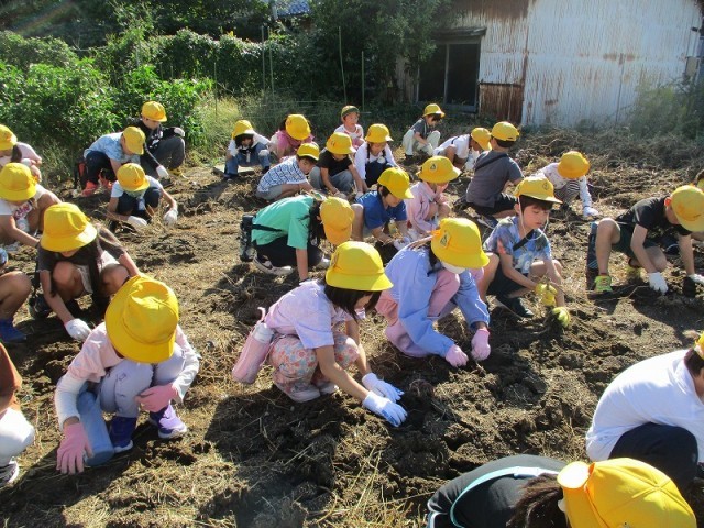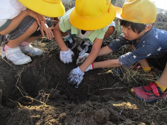 さわやかな秋晴れの下、2年生と3,4,5組の児童はサツマイモ掘りをしました。野菜の先生である横井さんに助けていただきながら、さまざまな大きさや形のサツマイモを見つけることができました。