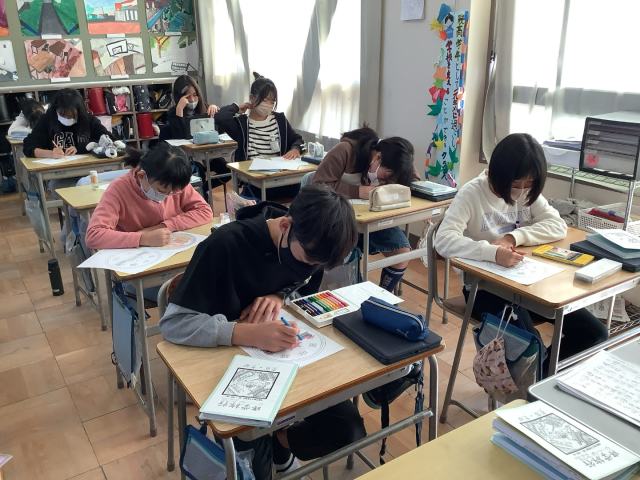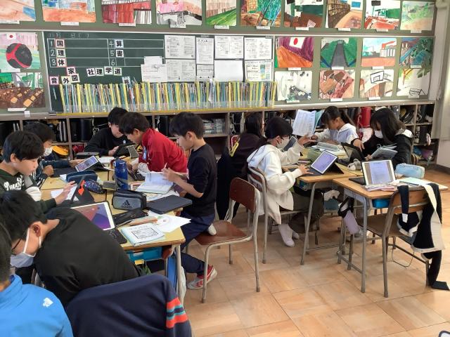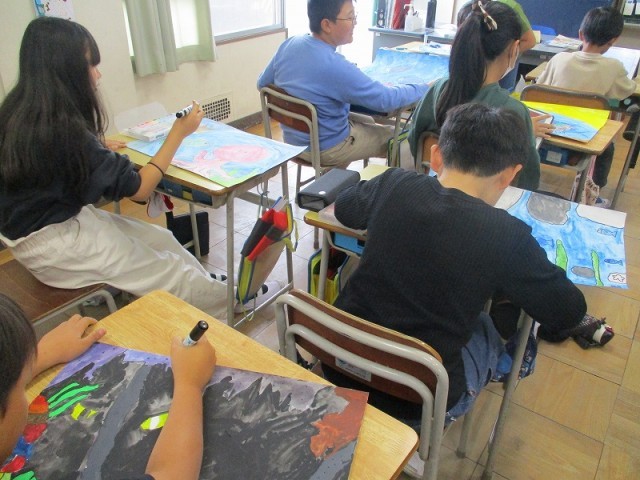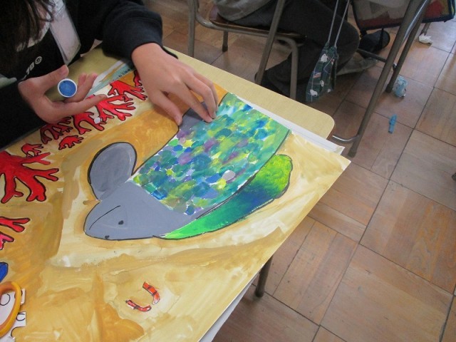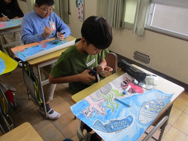 5年生の図画工作では、「にじいろのさかな」を読んで読書感想画を描いています。本を読んで心に残ったことや想像したことを、一人一人工夫して表現しています。