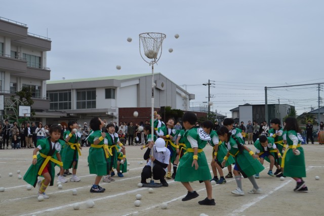 玉入れは、勝利を目指して、玉を一生懸命投げ、かごにたくさん入れることができました。ダンスは、音楽に合わせて合体ポーズをし、紅白・学年を超えてみんなで力を合わせて、笑顔いっぱい、元気いっぱい踊ることができました。会場にいるみなさんが送ってくれた元気のおかげで、かっこいい必殺技を決めることができました。