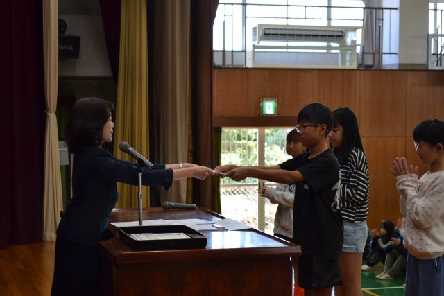 まず、後期の児童会役員の児童に校長先生から任命状が手渡されました。児童会長からは、後期の活動に向けた抱負が語られました。次に、2年生から6年生の学級委員の児童が任命状を受け取りました。その後、読書感想文コンクールと健康優良児、社会を明るくする運動作文コンテストの表彰を行いました。