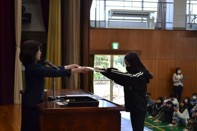 1時間目に、後期児童会役員・学級委員任命式と表彰伝達を行いました。
