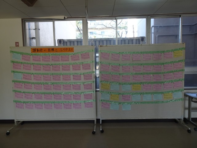 児童会活動として、10月28日(火)~31日(金)の一週間、昇降口で、「運動会の目標とふりかえり」を行っています。「ダンスを大きく踊る。」「徒競走を全力で走りきる。」など、個人でたてた目標に対して振り返ることで、自分の成長に気付くことができたようです。目標に向かって努力したり、達成したりした経験を、これからの学習や生活につなげられるとよいと思います。