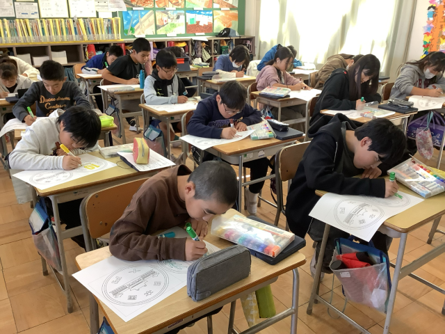 来週の月曜日から行く修学旅行に向け、6年生はお土産の計画表を作ったり、写真を撮るときに使う10円玉に色を塗ったりしました。