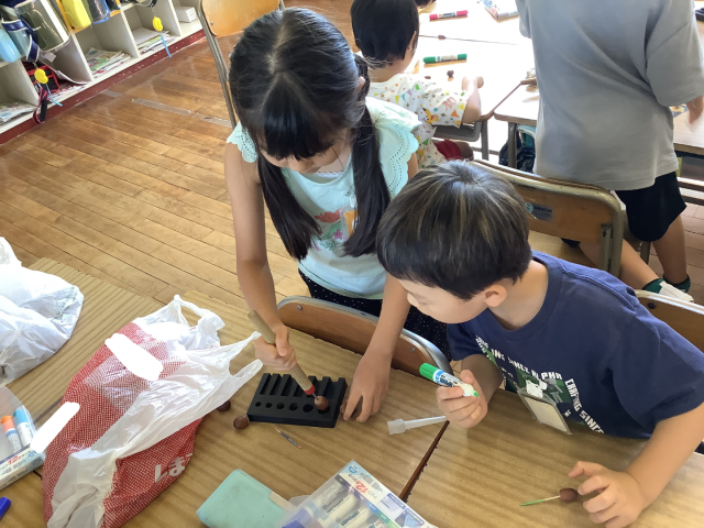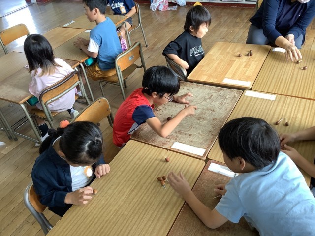 生活科では、先週の拾ってきたどんぐりを用い、どんぐりこまを作っています。安全に気を付けながら、自分でどんぐりに穴をあけました。その後、思い思いの色を塗り、オリジナルどんぐりごまで遊びました。