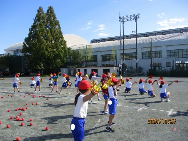 運動会の練習もだいぶ進み、児童は並び方をしっかり覚え、一生懸命踊ったり、玉入れをしたり、走ったりしています。当日まで赤・白どちらが勝つかわかりません。1年生のかわいいダンスでお家の方がハッピー☆スマイルになるといいなと思っています。楽しみにしていてください。