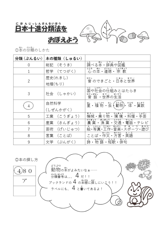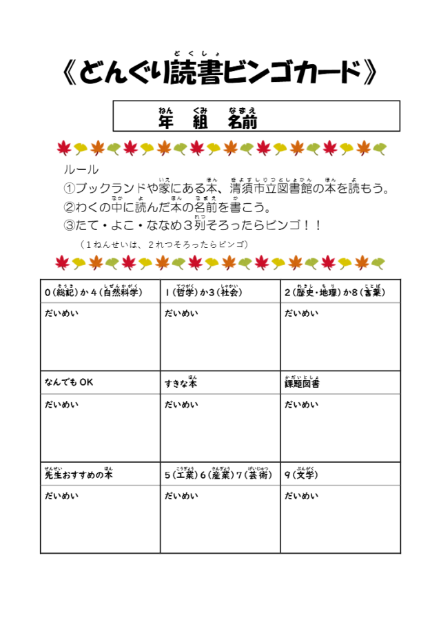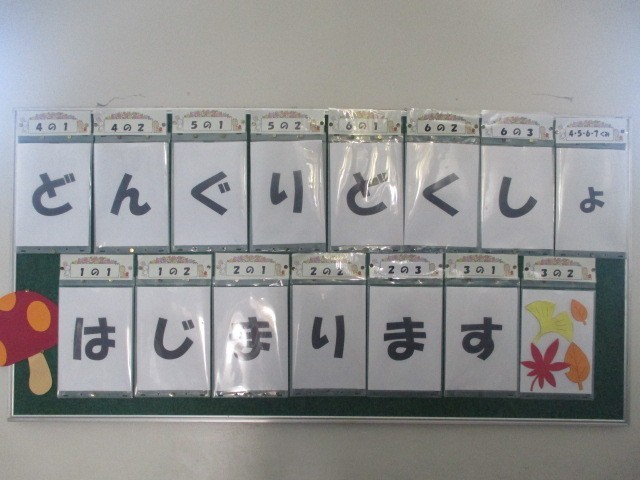 本日から11月20日(木)まで「どんぐり読書週間」となります。児童は読んだ本の題名を「どんぐり読書ビンゴカード」に記入したり、本の内容を読書の記録としてまとめたりします。また、日本十進分類法や図書室の本の配架方法、本のラベルの読み取り方を学習します。さらに、給食時に図書委員による読み聞かせや、ペア学年による読み聞かせも企画しています。