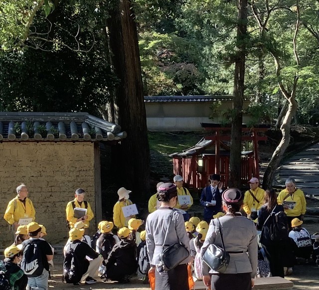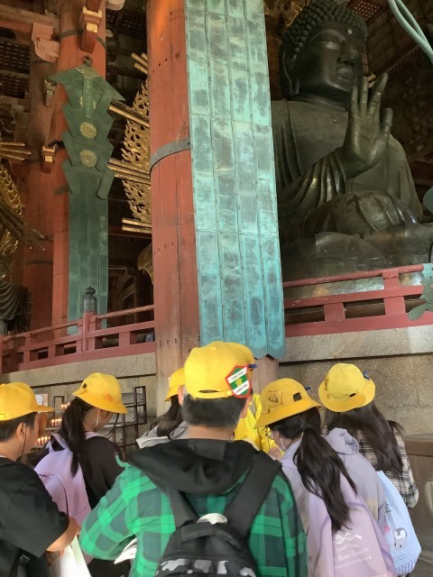 ボランティアガイドさんに案内されながら大仏殿の中の見学です。実物の迫力に驚きながら、ガイドさんの話をしっかり聞きます。
