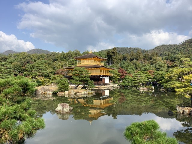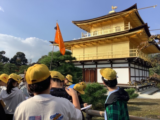 2日目最初は金閣寺の見学です。金色に輝く金閣寺の佇まいに歓声が上がります。今日は天気も良く、水面に金閣寺が浮かんで見えました。少しずつ紅葉した景色も美しいです。