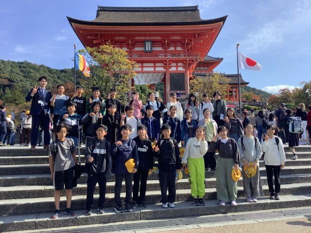 清水寺での見学です。集合写真を撮り、有名な清水の舞台を見学しました。想像より高い舞台に驚きつつ絶景を眺めました。