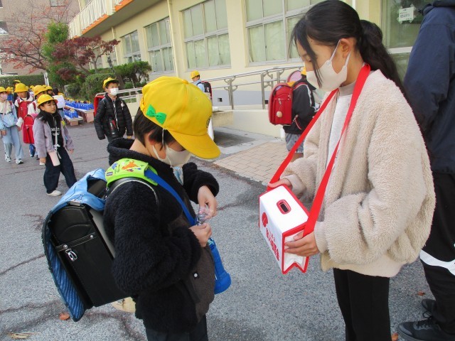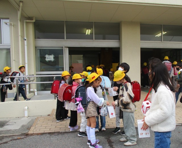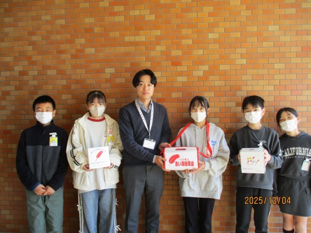 先月の27日・28日に赤い羽根共同募金を行いました。2日間の募金で児童のみなさんから温かい気持ちをたくさんいただきました。集まった募金を本日、清須市社会福祉協議会の共同募金委員会の方にお渡ししました。集められた募金は、お年寄りや障害のある人、子育て中の人など、助けを必要としている人たちを支え、誰もが暮らしやすい町づくりのために役立てられるそうです。ご協力ありがとうございました。