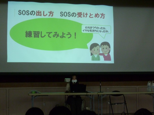 「SOSの出し方、受け止め方」~話してみよう!大切なあなたに伝えたいこと~というテーマで、健康推進課の保健師さんを講師にお招きして講話をしていただきました。困っているときにSOSを出さないとストレスがいっぱいになり、心の調子や体の調子が悪くなることを学び、自分だったらどうするかを考えることができました。