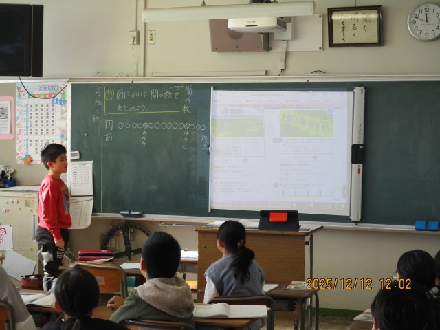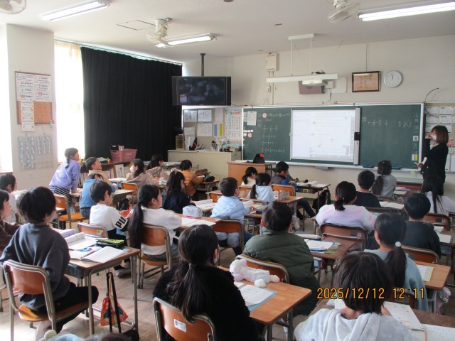 算数の授業の様子です。1組は「分数」の単元で、分数のひき算について学びました。2組は「間の数」の単元で、図を使って答えを導き出し、みんなに伝わるように考えながら説明をしました。