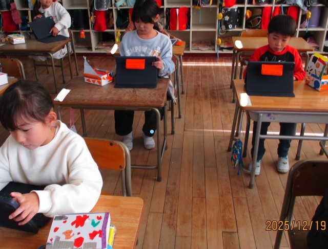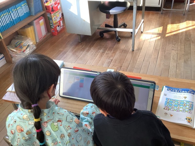 2組は、完成した図工の作品を写真に撮って送ったり、どのように指示を出すとロボットが目的地までたどり着けるかを考えるプログラミングを隣の席の児童と相談しながらしていました。