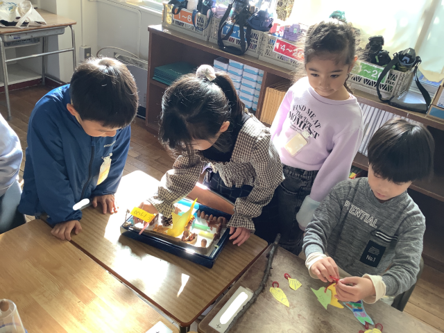 生活科で、2学期に取り組んでいた「たのしいあきいっぱい」でつくった作品をお見せします。楽しく遊べるよう計画したおもちゃや、秋の自然物をたくさん貼ったお面など素敵な作品をたくさん作りあげることができました。ご家庭でたくさんの準備をしてくださり、ありがとうございました。
