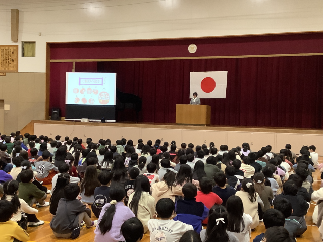 校長先生からは、「七転び八起き」のお話があり、だるまの目標シートのプレゼントがありました。