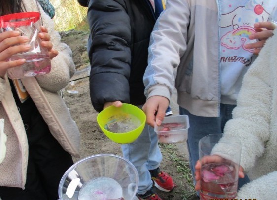 生活科「ふゆをたのしもう」で、氷づくりを行いました。毛糸や、葉っぱ、さざんかの花びらを水に浮かべて、外に置きました。児童は、仕掛けておいた氷がどうなったのかわくわくしながら見に行きました。寒さにも負けずに、子どもたちは出来上がった氷に歓声をあげていました。薄く氷が張っているものや、しっかり凍っているものなど、さまざまな様子を見つけて楽しそうに観察していました。容器の準備をしてくださった保護者の皆様、ご協力ありがとうございました。