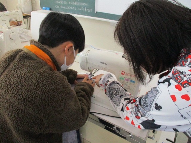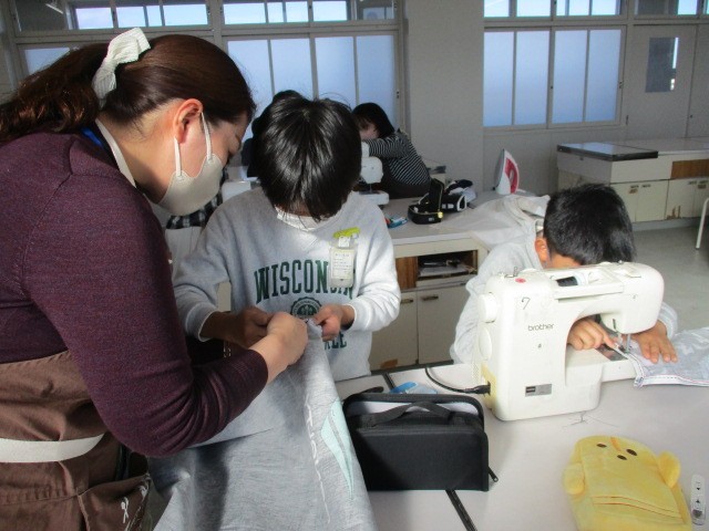 家庭科の学習で、エプロンを製作しています。1月より、学校支援ボランティアの皆さんにもお手伝いいただき、完成まであと少しとなってきました。困っているときに助けていただき、安心安全に学習できます。いつもありがとうございます。