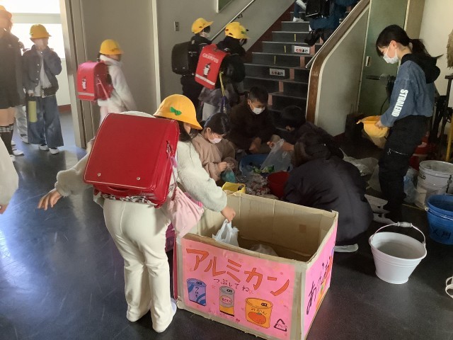 多くの児童が協力をしてくれ、今日もたくさんのアルミ缶、エコキャップが集まりました。