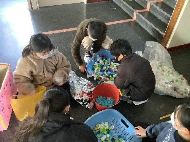 児童会が中心となって、アルミ缶とペットボトルのキャップの回収を行っています。回収する期間には、児童会からお昼の放送で呼びかけ、持ってくるときの注意点も伝えてくれています。
