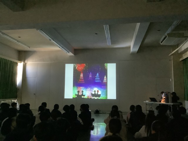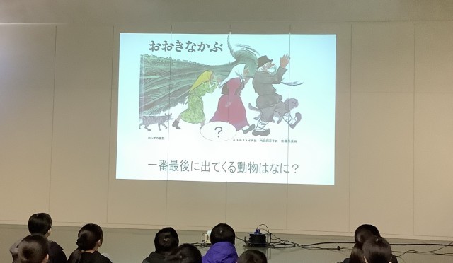 スライドを使っての読み聞かせは「銀河鉄道の夜」でした。本当の幸せとは何かというメッセージが込められたお話に、どの児童も深く集中して聞いていました。
