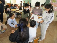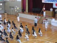名古屋を拠点とするバレーボールチーム「ウルフドッグス名古屋」によるあいさつ運動が行われました。選手2名に加え、ウルフドッグス名古屋のマスコットキャラの「ウルドくん」も一緒にみんなをお出迎えしました。あいにくの雨で、昇降口の中でのあいさつ運動になりました。