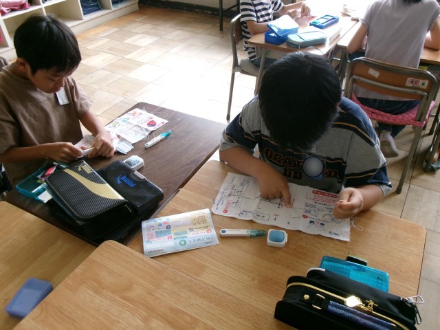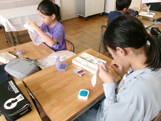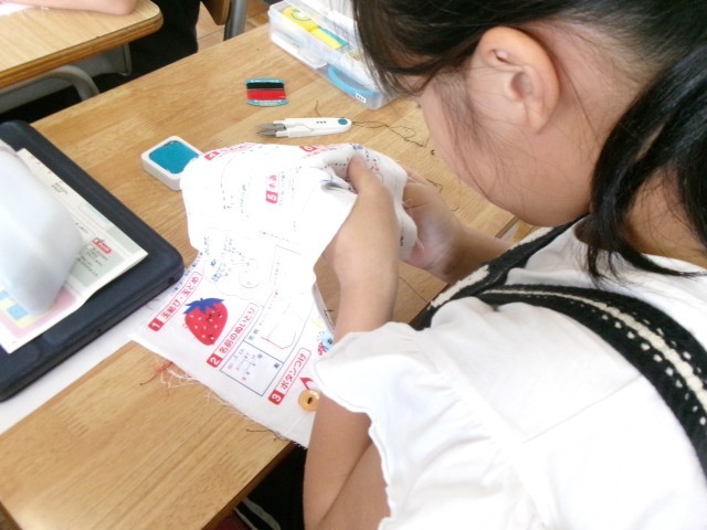 5年生の家庭科では、縫い針の使い方を練習しています。今日は、本返し縫いと半返し縫いの練習をしていました。なみ縫いよりも複雑な作業になるので、どこに針を通していくのかをよく確認しながら縫い進めていました。