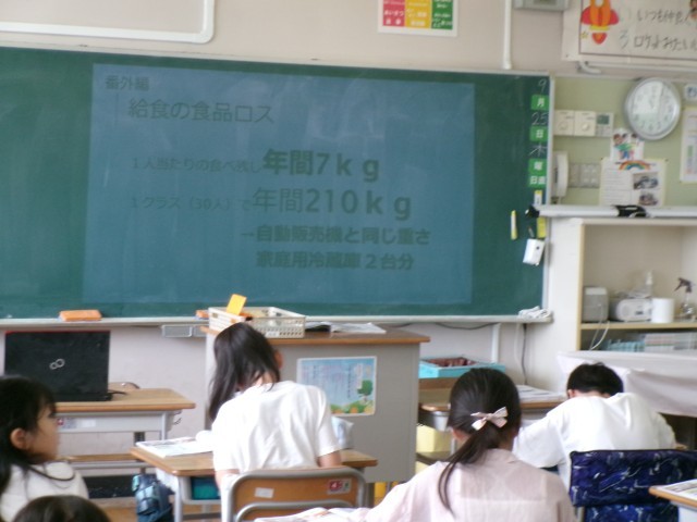 日本は食料自給率が主要国と比べて低く、外国からの輸入に頼っているということが分かりました。また、大量の食品を捨てているという「食品ロス」の問題を抱えていることを知りました。子どもたちにとって身近な給食における食品ロスは、平均で一人当たり年間7kgというデータを見て、「え、そんなに!」「もったいない。」という声が上がりました。その後、食品ロスを減らすために自分ができることを考えていました。