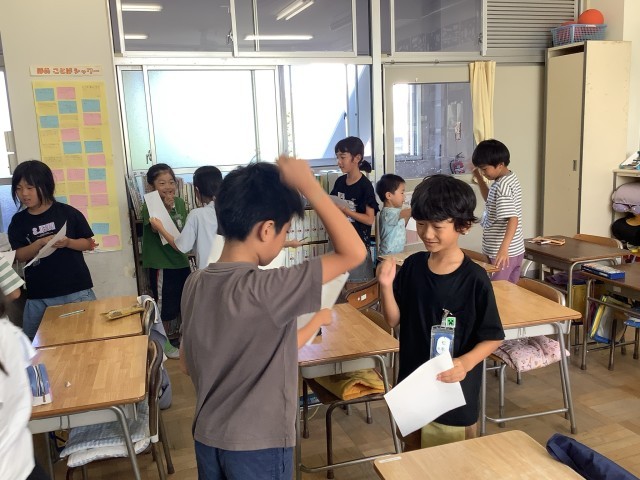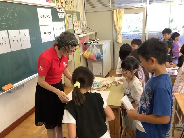 国際交流の授業でエリザベス先生とスペイン語を学習しました。スペイン語であいさつをしたり、じゃんけんをしたりしました。初めは慣れない言葉に緊張していましたが、授業の最後には自信をもって声に出していました。