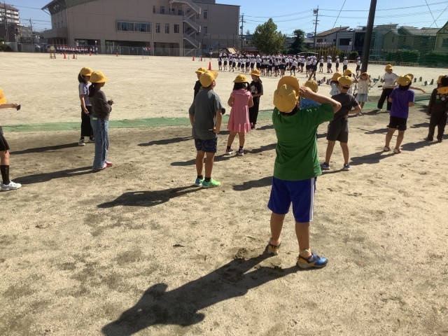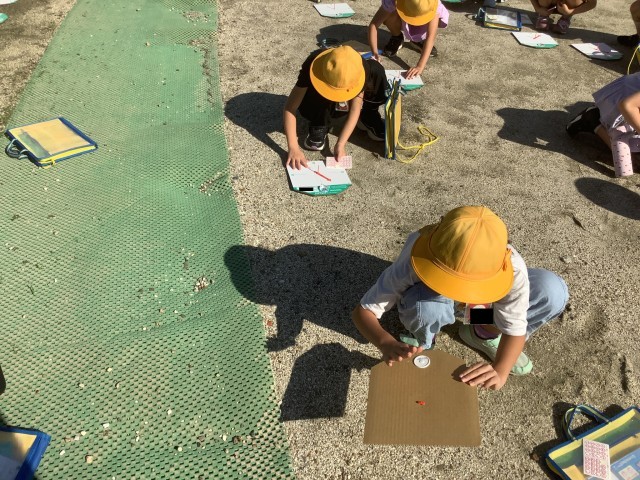 自分の影をみつけてから「回れ右」をして空を見上げると、太陽があることに気付き、光をさえぎるものがあると太陽の反対側に影ができることが分かりました。また、1日を通して、影は動くのか調べています。
