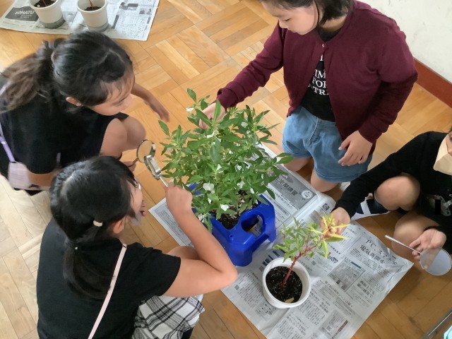 天候が優れない日は、ホウセンカの観察をしています。小さな種からここまで大きくなり、実の中には種がたくさん入っていることを知りました。