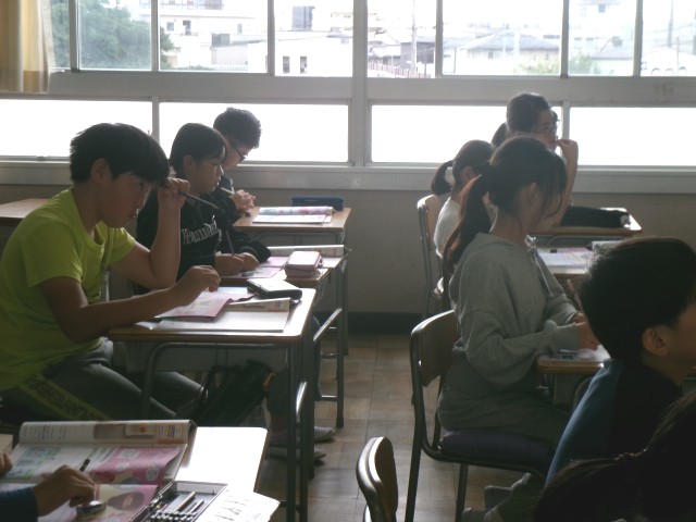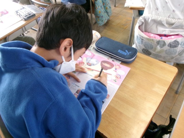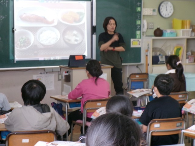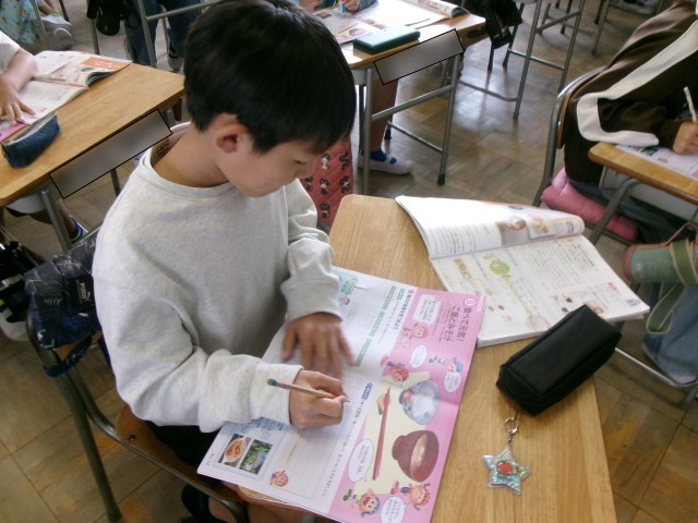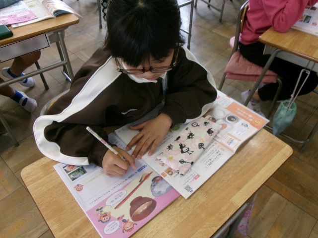 日々の食生活を振り返ると、自分たちはお米をよく食べていることに気付きました。そして、和食にはどのような食材が使われているかという問いに対し、「野菜が多い」や「魚が出る」といった意見をノートに書き込んでいました。