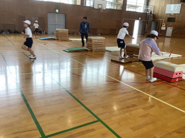 体育では、キックベースと跳び箱に取り組んでいます。だんだんベースボール型のゲームに慣れていけるといいともいます。跳び箱では、新しい技に挑戦しています。
