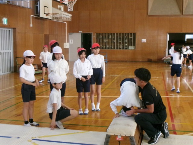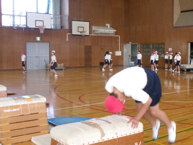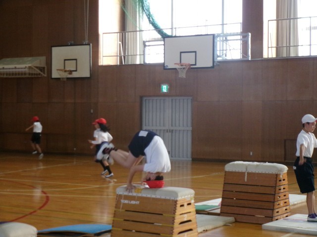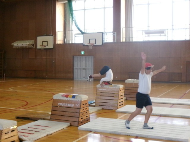 跳び箱の上で前転を行う台上前転の練習風景です。普通のマット上での前転とは違って、台から落ちるようにして着地するので、着地後にピタッと止まることを意識して練習していました。