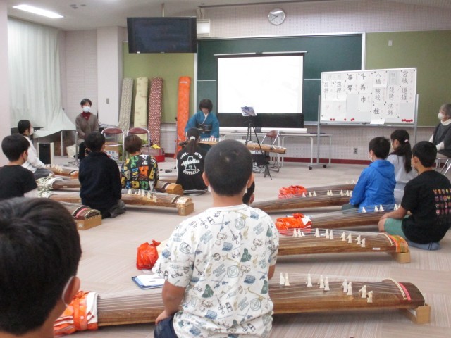 実際に演奏を聴かせていただき、「箏」の歴史などについて説明していただきました。最後には、皆で「さくらさくら」を演奏することもできました。